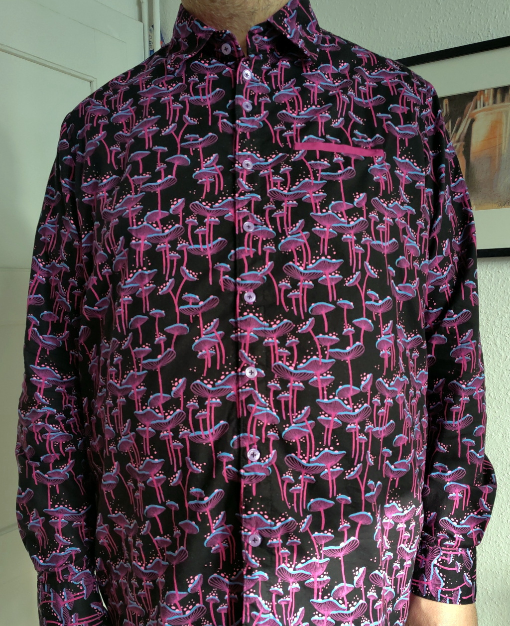 The fabric is basically oriented up in most of the parts, but the cuffs are rotated by 90°. When I look at my cuffs, the mushrooms are upright, but others looking at me will see them upside down in this position.