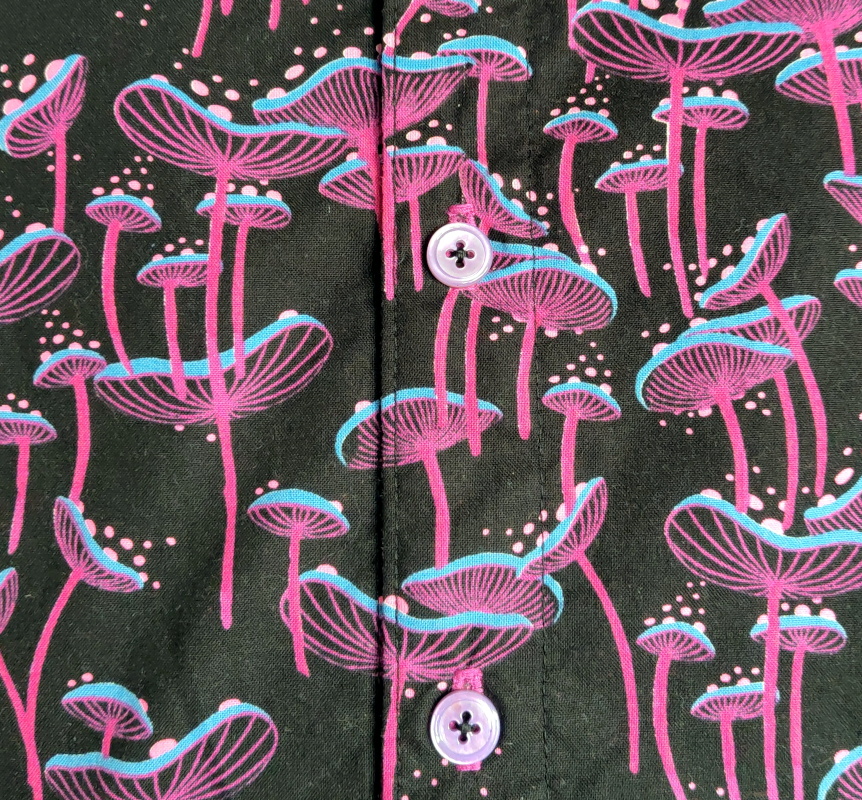 The shirt has shiny, colour coated mother-of-pearl buttons.