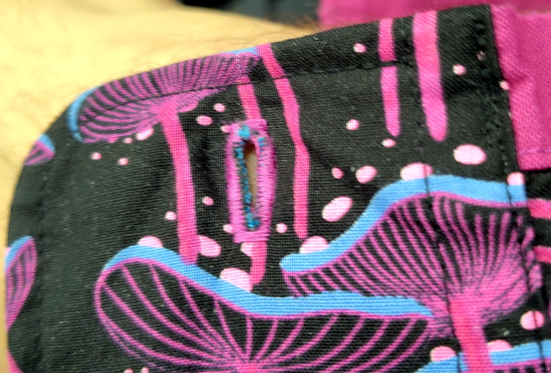 so that the machine-stitched button holes will have some visible blue thread ends